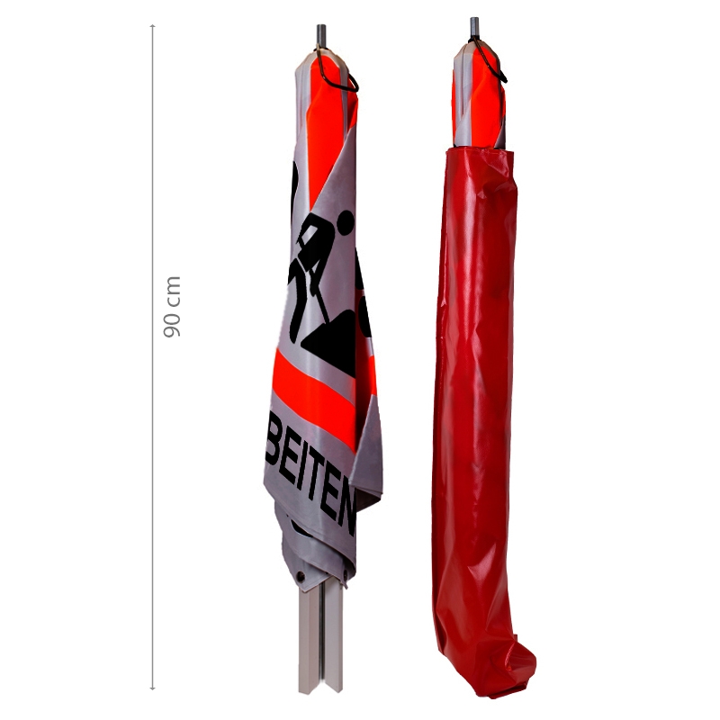 Diese Ausführung mit Federmechanismus ist 2,9 kg schwer; Für mehr Standsicherheit empfiehlt sich das Stabgewicht (1,4 kg) aus dem Zubehör. Die Handhabung ist einfach: das Faltsignal am klappbaren Tragebügel hochheben, den Tragebügel leicht schwingen. Die Pyramide öffnet sich. Mit einer Höhe von 70 cm bietet die retro-reflektierende Folie von Weitem eine gute Sichtbarkeit bei einfallendem Licht und gewährleistet erhöhte Sicherheit.