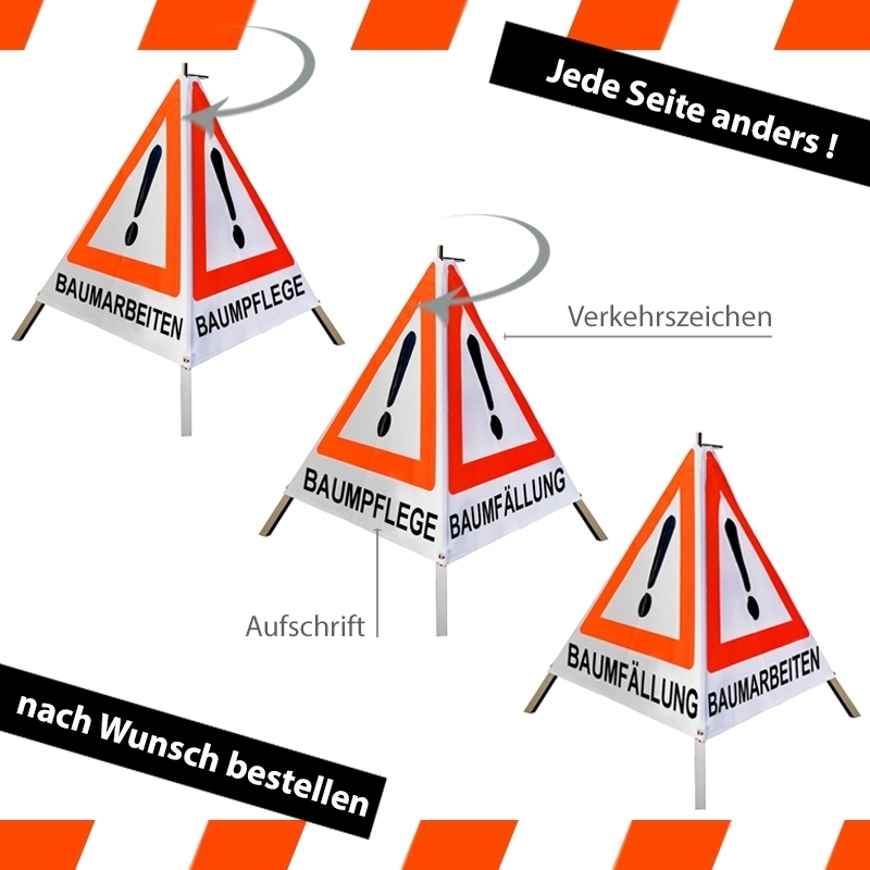 Dieses Faltsignal mit Warnpyramide Verkehrszeichen 101 (Achtung!) hat drei unterschiedliche Aufschriften: "BAUMARBEITEN/ BAUMPFLEGE/ BAUMFÄLLUNG" und kann zum Beispiel von Landschaftsgärtnern flexibel eingesetzt werden. Zur Warnung des Durchgangsverkehrs vor potentiellen Risiken und Schäden und zur Abwendung von Folgeunfällen kann je nach Bedarf und Situation die jeweilige Seite in Sichtrichtung aufgestellt werden. Das leuchtrote Warndreieck auf weißem retro-reflektierendem Grund sorgt für eine sofortige Wahrnehmung und Aufmerksamkeit; Fahrzeugfahrer sind zur Herabsetzung ihrer Geschwindigkeit angehalten.