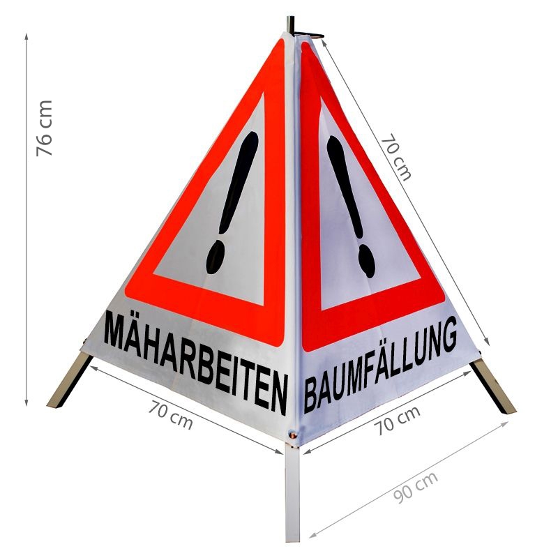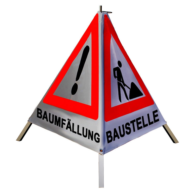 "Warnpyramide/Faltsignal - BAUMFÄLLUNG (VZ101) / MÄHARBEITEN (VZ101) / BAUSTELLE(VZ123)"