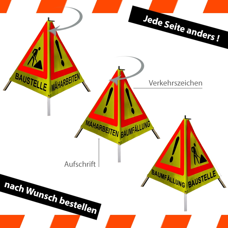 "Warnpyramide/Faltsignal - BAUMFÄLLUNG (VZ101) / MÄHARBEITEN (VZ101) / BAUSTELLE(VZ123)"
