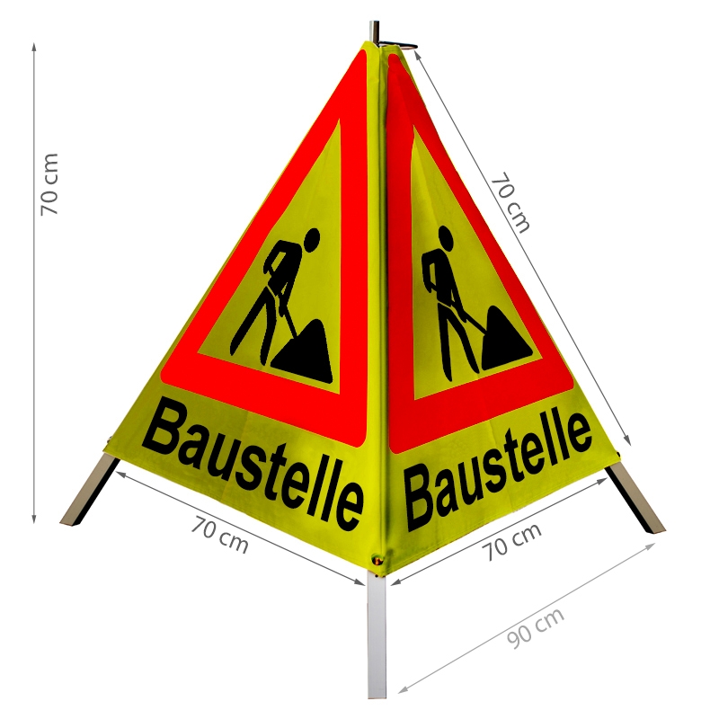 Diese 70 cm Ausführung in retroreflektierend gelb mit Mittelfuß wiegt 1,7 kg und lässt sich mithilfe des klappbaren Tragegriffs durch eine schwungvolle hin und her Rotation leicht aufstellen. Die robuste Dreifußkonstruktion besteht aus eloxiertem Aluminium und trotzt jeder Wetterlage. Mit einer Höhe von 76 cm bietet das leuchtrote Dreieck auf retro-reflektierend gelber Folie allen Verkehrsteilnehmern selbst von Weitem eine sehr gute Sichtbarkeit und gewährleistet so eine erhöhte Aufmerksamkeit. Der Bezug kann aufgrund der Druckknöpfe ausgewechselt werden.