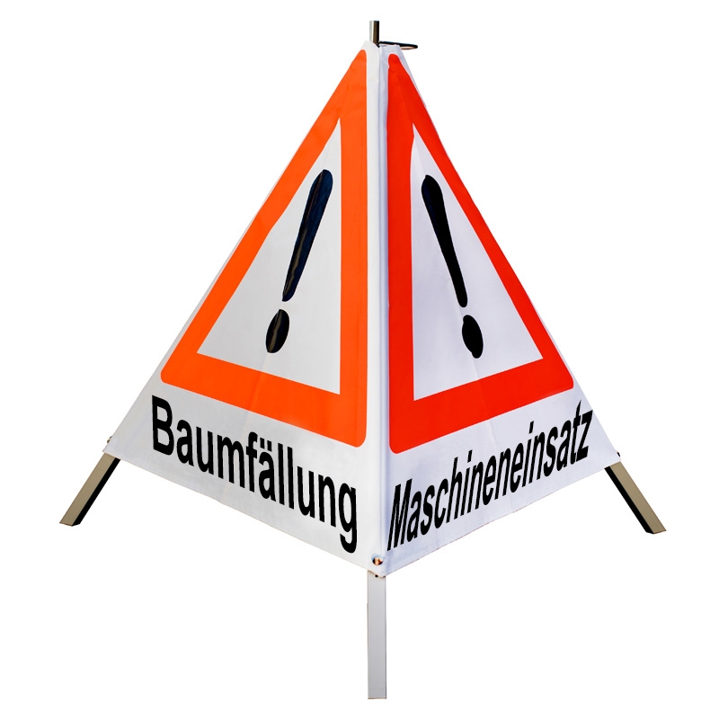 "Warnpyramide/Faltsignal - Mäharbeiten / Baumfällung / Maschineneinsatz - VZ101-Ausrufezeichen"