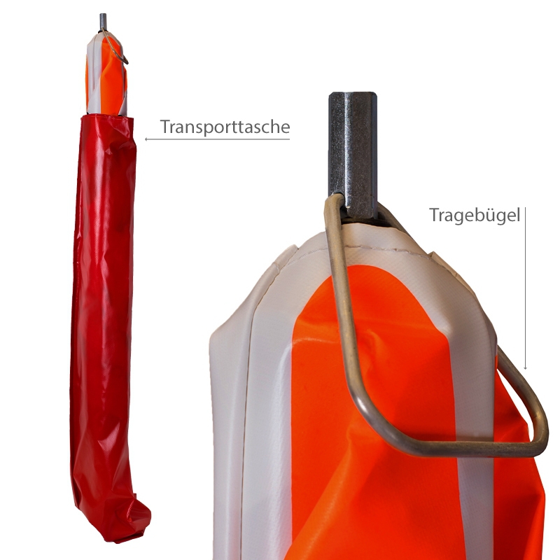 Diese 90 cm Ausführung in retroreflektierend weiß mit Federmechanismus ist schwer in Gewicht (3,4 kg) und sorgt so für mehr Standsicherheit und Stabilität. Die Handhabung ist kinderleicht – einfach den klappbaren Tragebügel hochheben, mit einer leichten rechts/links Bewegung aufschütteln und am Einsatzort ablegen. Fertig. Die robuste Dreifußkonstruktion besteht aus pulverbeschichtetem Stahl und trotzt somit jeder Wetterlage.