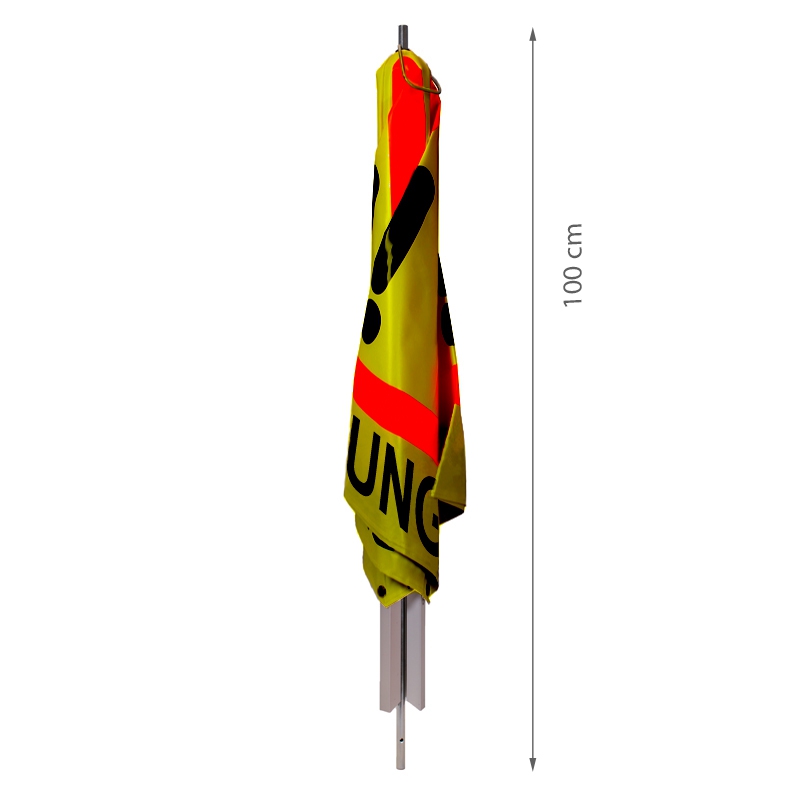 Diese Ausführung mit Mittelfuß in retro-reflektierend gelb ist leicht aufgestellt - den Tragebügel hochheben, am Einsatzort abstellen, fertig. Mit einer Höhe von 76 cm ist das Faltsignal selbst von Weitem gut sichtbar.