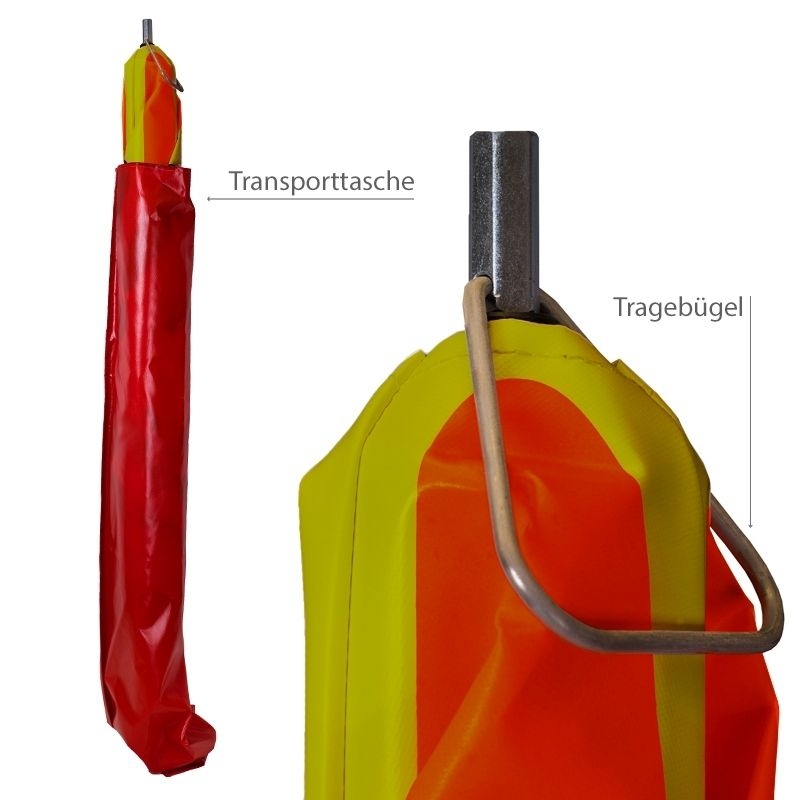 Diese Ausführung mit Federmechanismus ist 3,4 kg schwer und bietet etwas mehr Standsicherheit als die leichte Ausführung. Zum aufklappen der Warnpyramide am Tragebügel hochheben, ruckartig schwingen, am Einsatzort abstellen, fertig. Mit einer Höhe von 90 cm ist das Faltsignal selbst von Weitem gut sichtbar.
