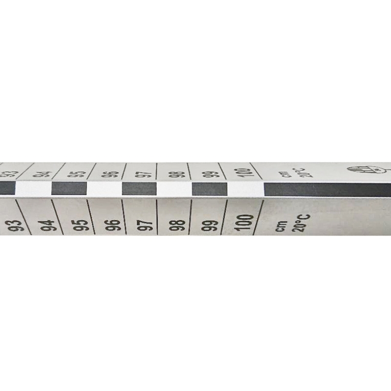 Die Messschiene besteht aus einem Alu-Dreikantprofil mit der Stärke 25 mm, welches silbern eloxiert wurde; somit sind die tief schwarzen Ziffern vor Abrieb geschützt und das Material vor Witterung. Die spezielle Legierung des Profils garantiert eine sehr hohe Biegefestigkeit; seine Form ermöglicht ein erleichtertes Ablesen der Messergebnisse von oben und den Seiten.