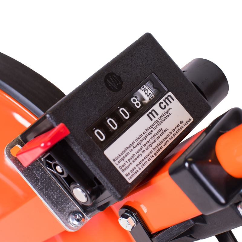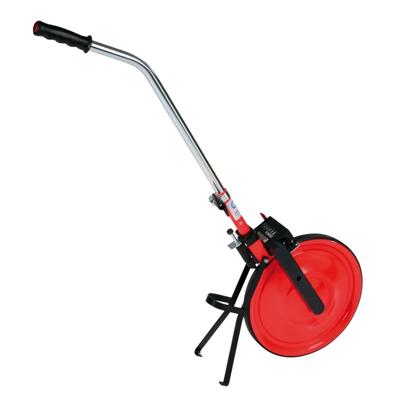 Präzisions-Messrad in Vollradausführung mit Abstellbügel, integrierter Bremse sowie einer klappbaren Führungsstange für die Vermessung von Strecken auf ebenem Gelände.