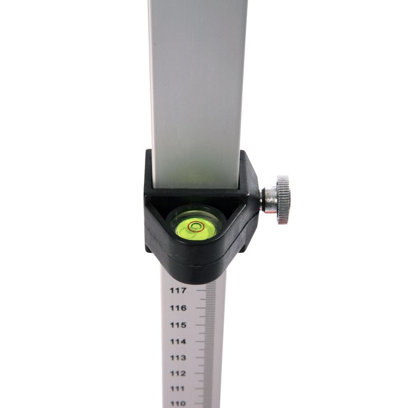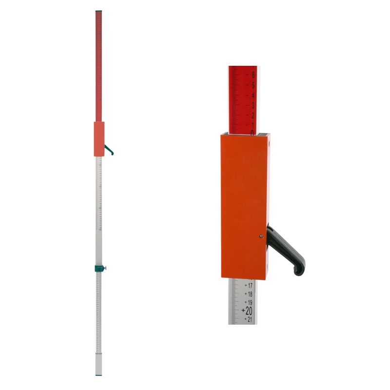 Höhenunterschiede können ganz leicht mithilfe der zweifarbigen Vorderseite der Latte bestimmt werden. Der obere Teil (rot) ist absteigend von 50 - 0 cm unterteilt; der untere (silber) aufsteigend von 0 - 50 cm. Abweichungen lassen sich durch das Verschieben des Empfängers entlang der Skalierung bis zur Empfangsebene ermitteln.Vorteile:
