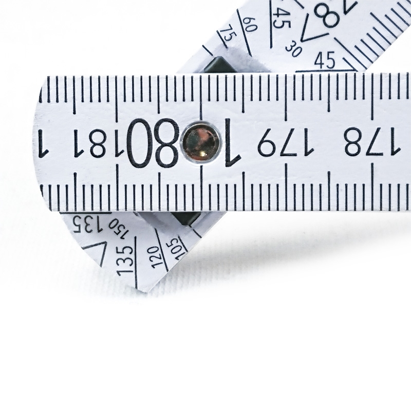 Der Gliedermaßstab aus Holz kann auch als Lineal verwendet werden, da aufgrund der versenkten genieteten Federn beim öffnen in die 180°-Stellung eine gerade Linie entsteht. Sowohl Vorder- als auch Rückseite haben eine cm/mm-Teilung als Maß-Skala an Ober- und Unterkante. Der Clou: Die Rückseite des ersten und letzten Glieds ermöglicht rund um die Federn die Messung von Winkeln, da hier entsprechend die gängigen Winkel markiert sind. Die Federn rasten diskret alle 90 ° ein und lassen sich leichtgängig stetig öffnen und schließen.