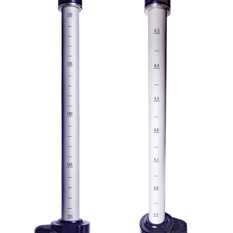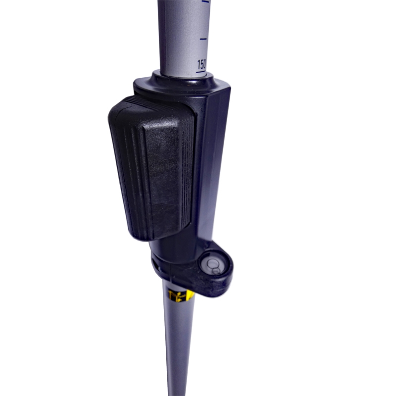Einfach mit einer Hand die richtige Höhe einrichten und mit der anderen Hand die Drucktaste klemmen. Dank der gummierten und robusten Druckklemmung, sowie der Stoßdämpfung ist der Prismenstab universell einsetzbar – auch bei Wind und Wetter. Außen- und Innenrohr sind eloxiert und unempfindlich gegen Witterungseinflüsse. Die Teilung ist mit einer patentierten Lasergravur angebracht und dadurch sehr robust. Die spezialgehärtete Spitze ist aus Aluminium und Edelstahl gefertigt und nutzt sich dadurch kaum ab.