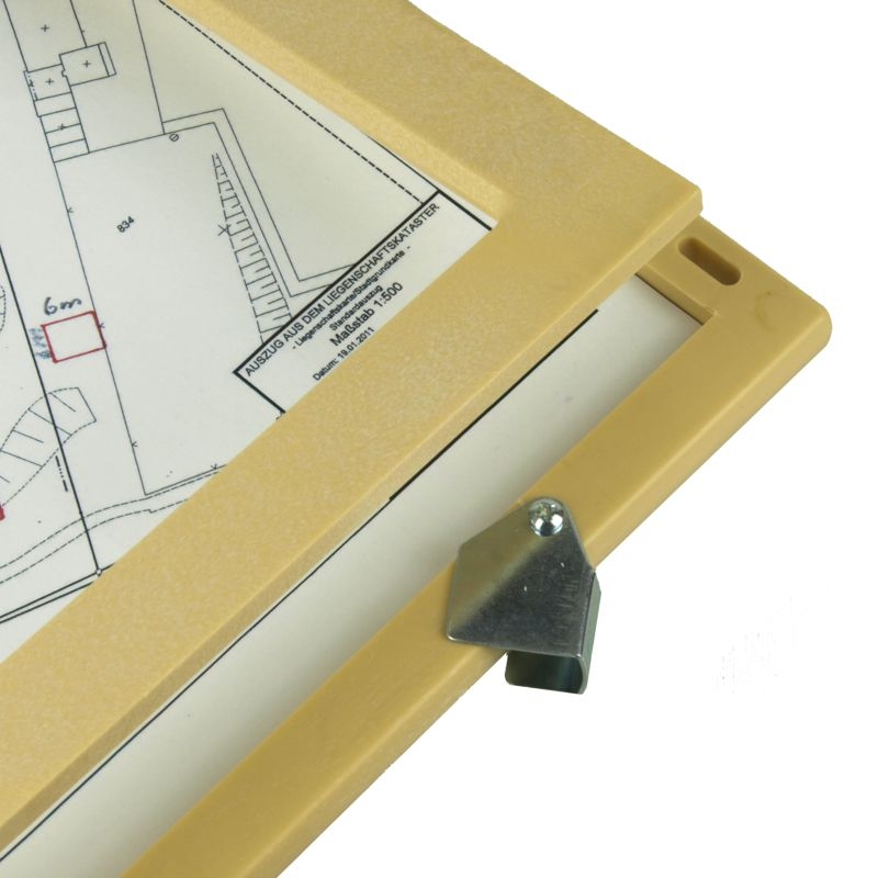 Der Feldbuchrahmen DIN A3 aus strapazierfähigem Kunststoff ist das standard Klemmbrett für größere Baupläne und Zeichnungen. Die Einlage aus Zelluloid bietet idealen Schutz vor Wind, Wetter und Gebrauch – auf Baustellen und auf dem Feld.